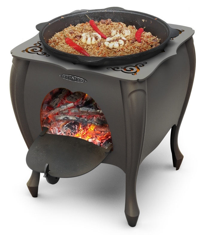 Отверстие под казан закрыто стальным варочным настилом со съемными чугунными кружками диаметром 12 и 18 см.Главное предназначение «Зухры» – это приготовление блюд в казане. Наличие варочного настила позволяет вскипятить большой чайник, приготовить шурпу, лагман, уху и другие блюда загородной летней кухни в кастрюле или на сковороде.